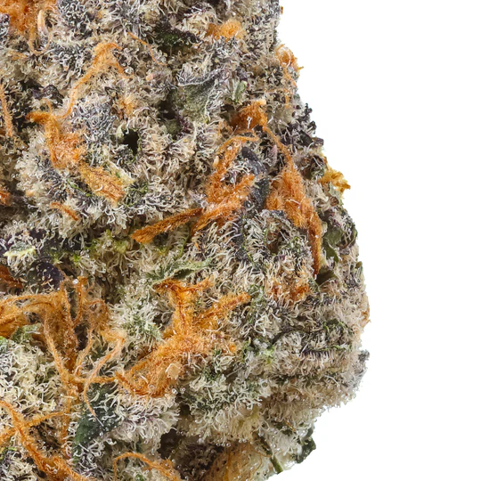 Côté visuel, la strain Oil Spill est un véritable bijou. Ses têtes, de taille petite à moyenne et de forme ronde, arborent un vert poussiéreux rehaussé de reflets néon et de nuances bleutées. Elles sont parcourues de fins pistils ambrés et littéralement couvertes d’une couche généreuse de trichomes cristallins, gage d’une résine de haute qualité. La texture est agréablement collante, signe d’une richesse en terpènes exceptionnelle.